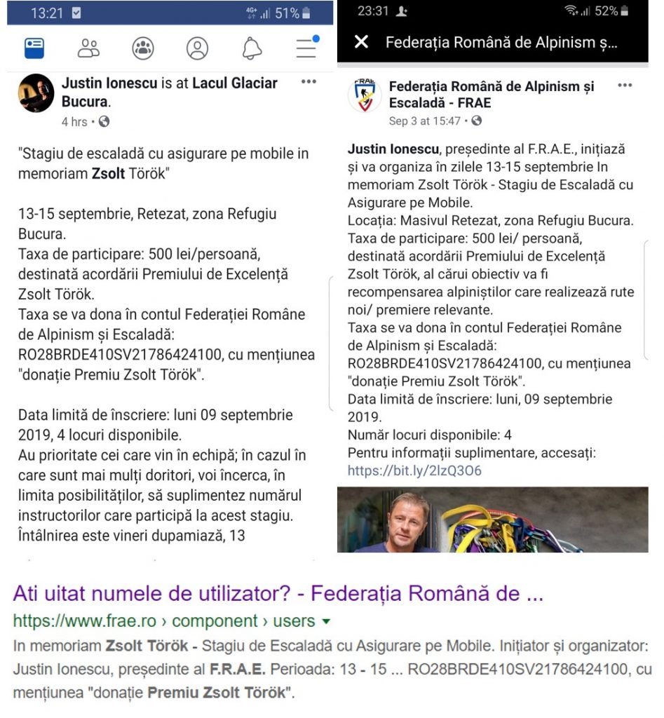 A doua situație: O asociere explicită cu imaginea lui Zsolt Török, în scopul atragerii de bani, a făcut-o Justin Ionescu, președintele Federației Române de Alpinism și Escaladă (FRAE). Ionescu a anunțat atât pe pagina sa personală de Facebook, cât și a Federației, că „inițiază și va organiza (…) in memoriam Zsolt Török un Stagiu de Escaladă cu Asigurare pe Mobile în Munții Retezat, taxa de participare fiind 500 de lei/persoană”. Obiectivul declarat al finanțării: acordarea unui premiu de excelență Zsolt Török (sursa: site-ul FRAE, respectiv o postare pe pagina de Facebook a Federației în data de 3 septembrie).