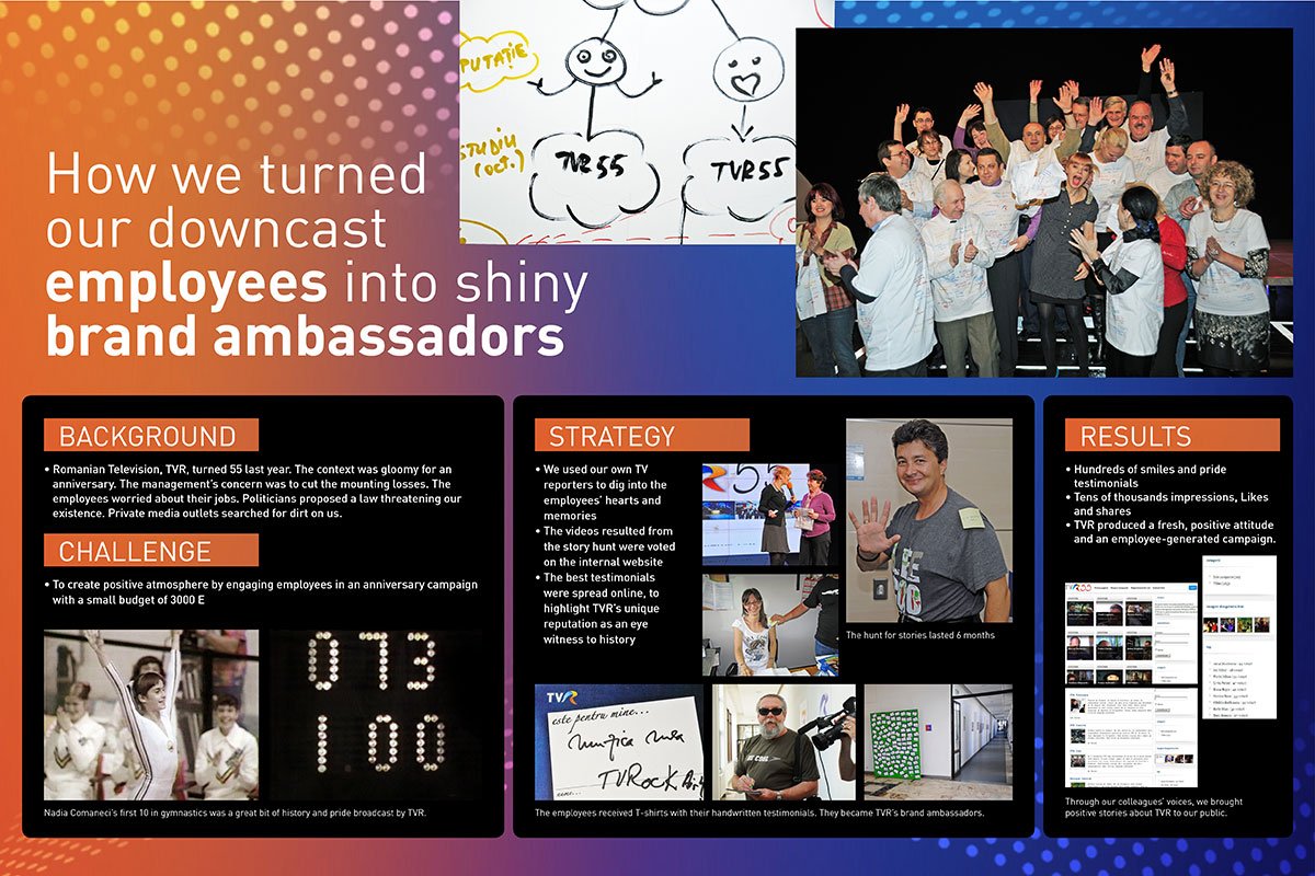 The Romanian national television, TVR saw its market share drop from 22,2% to a meagre 7,6% in just five years. Most of its viewers were aged people. To be more appealing to a younger audience, TVR made a 180 degree turn in its approach to PR and communication activities.