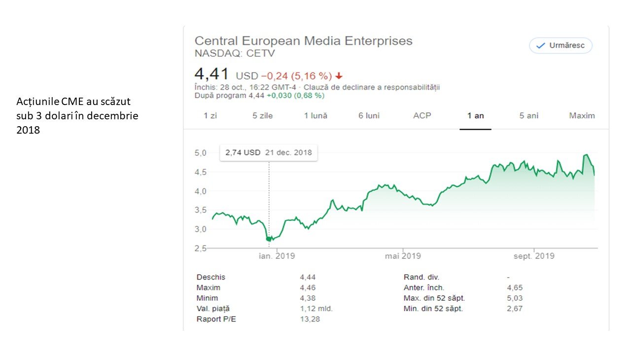 Negocierile dintre PPF și CME nu erau o noutate; miliardarul ceh Petr Kellner încercase în trecut să cumpere afacerea CME din Bulgaria, Nova Broadcasting, dar autoritățile bulgare au blocat tranzacția. Probabil că mișcarea n-a fost primită cu brațele deschise de investitori din moment ce, în acea perioadă de vânzoleală, acțiunile CME au scăzut sub 3 dolari (grafic 1 – decembrie 2018).